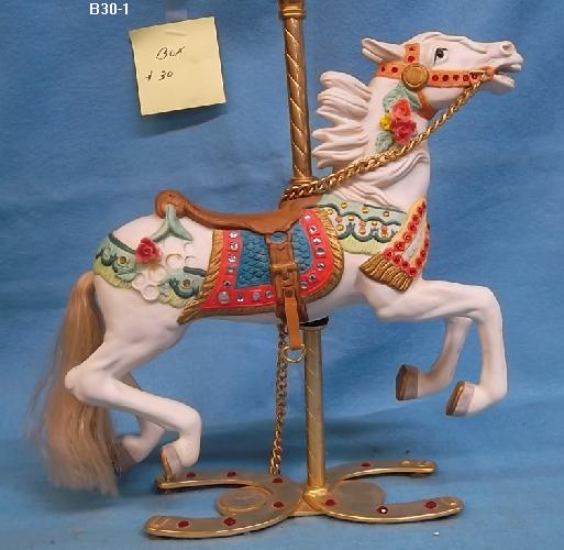 A Tobin Fraley white carousel horse. Has a chain reins and a double horseshoe base. Approx 12 x 9" 7 x 3"