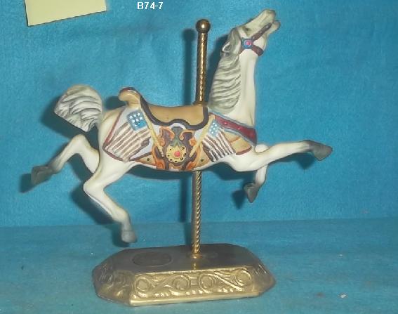 A Tobin Fraley Parker stargazer carousel horse with flags on side. Approx 8 x 8" 5 x 5"