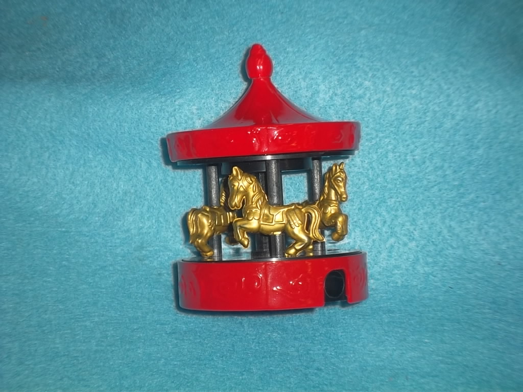 A cast metal carousel pencil sharpener. Horses rotate around when pushed. 3 1/4 H x 2 1/4 W"