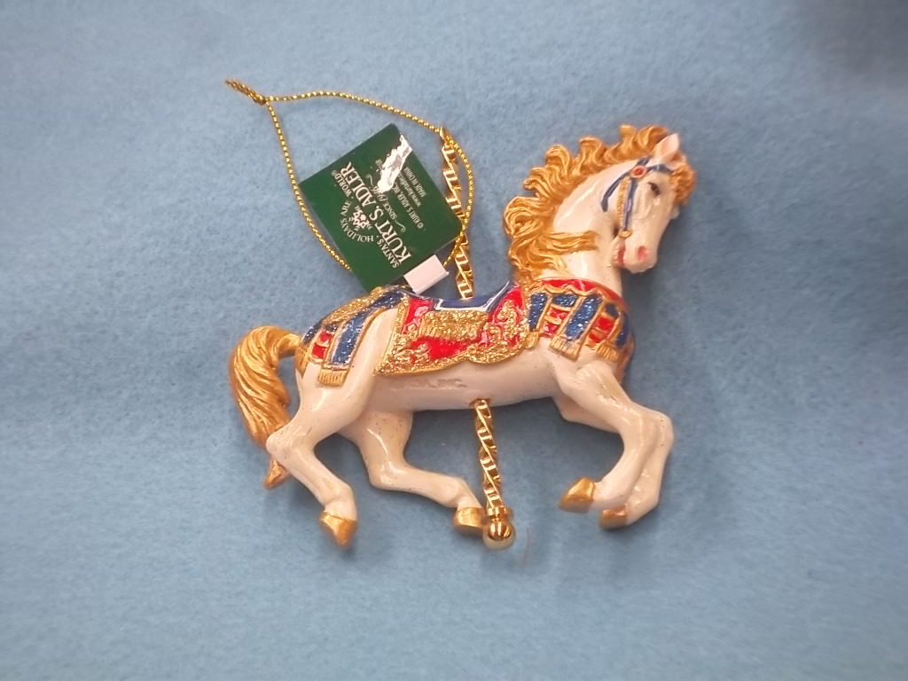 A new Kurt Adler Carmel style white carousel horse from the set for 2025. Made of resin. Approx 4 x 4".