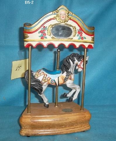 A white carousel horse with a black mane and a rounding board. Approx 12 x 7 x Music box works and plays When the saints come marching in.