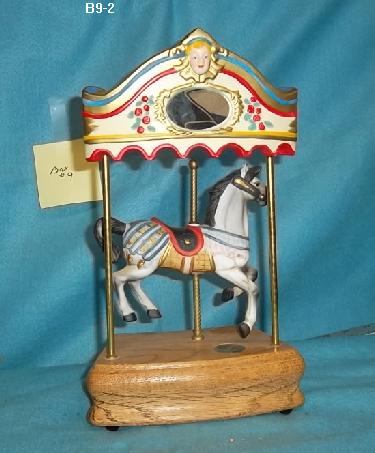 A white carousel horse with a rounding board back drop. Approx 12 x 7 x 6" Music box does work and plays East side, west side.