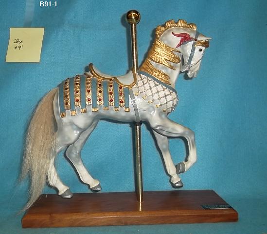 An Illions style carousel horse with a hair tail. Has jewels on rump straps. Approx 13 x 11 x 4"
