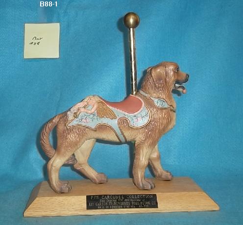 A PTC St. Bernard from the Kit Carson carousel in Burlington, CO. The back leg on the non-romance side has been broken and reattached. The piece was kept at the factory as there are some of the trapping colors noted on the non-romance side. Approx 11 x 11 x 4"