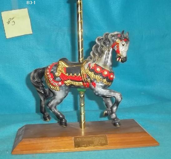A dark gray dapple Looff style horse with jewels. Over all size is 12" H. X10" L X 4 3/4" W.
